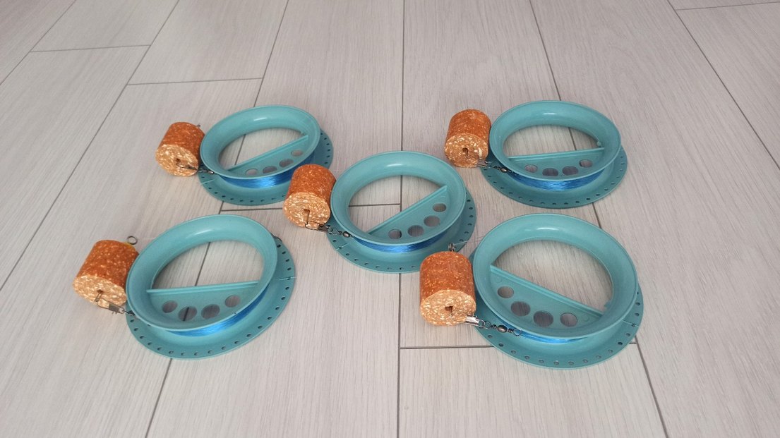 5 adet kasnakta 4 iğneli kuspeli el oltalari kasnaklarda 0.60 mm kalınlığında 50 metre misina sarılı