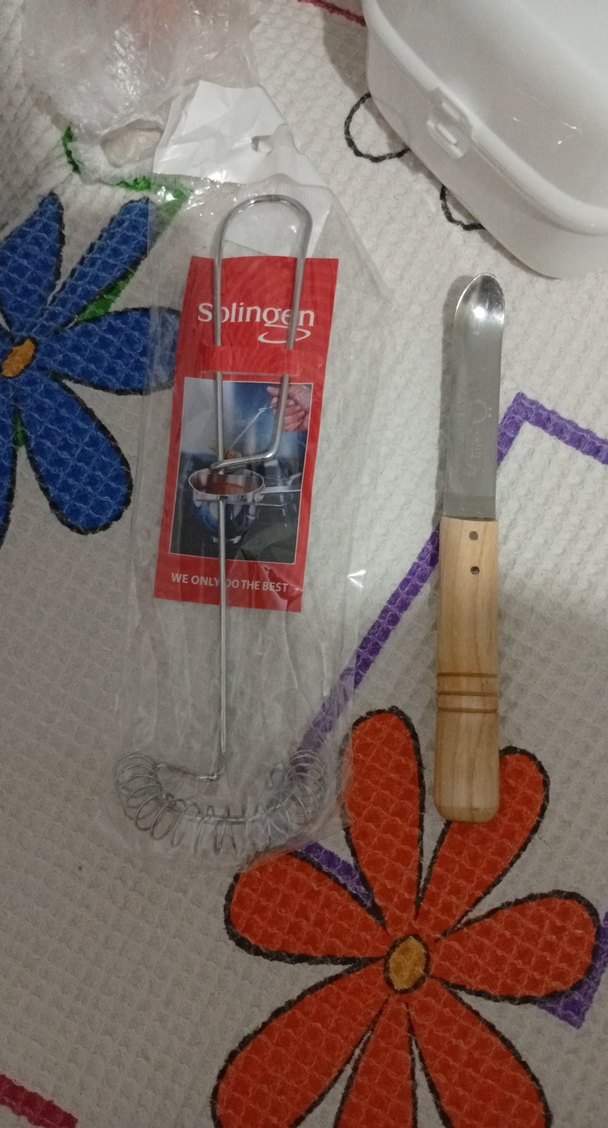 Beyaz saplı bıçak ve metal çırpıcıdan oluşan set, hafif ve mutfakta kullanışlıdır. Çırpıcının yay şeklinde tasarımı vardır.