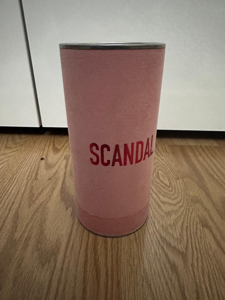 SCANDAL kadın parfümü, pembe silindirik kutuda. Kutunun üzerinde kırmızı büyük harflerle yazı yer alıyor.