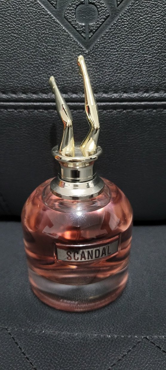Scandal kadın parfümü, bacak şeklinde altın kapaklı cam şişede pembe sıvı içerir. Zarafet ve cesareti bir araya getirir.
