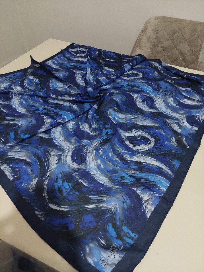 Koyu mavi renkte, ipeksi dokulu ve drapeli tasarıma sahip, çağdaş ve avangart tarzda bir fular.