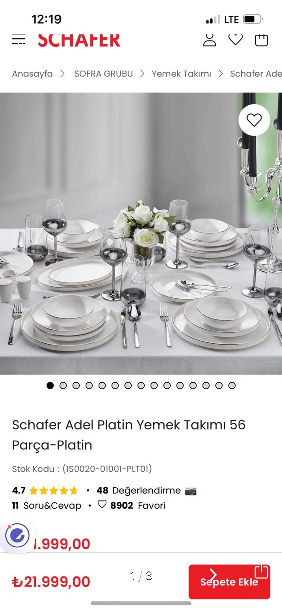 Schafer Adel Platin 56 parça yemek takımı, ince platin detaylı beyaz tabaklardan oluşur ve şık bir sunum sağlar. ️