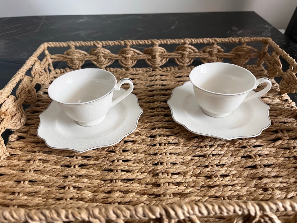 İnce dokulu beyaz gümüş detaylı kahve fincanı ve uyumlu tabaklardan oluşan set. Zarif kulplarıyla toplamda 12 adet kahve fincanı ve 12 adet fincan altlığı. ☕