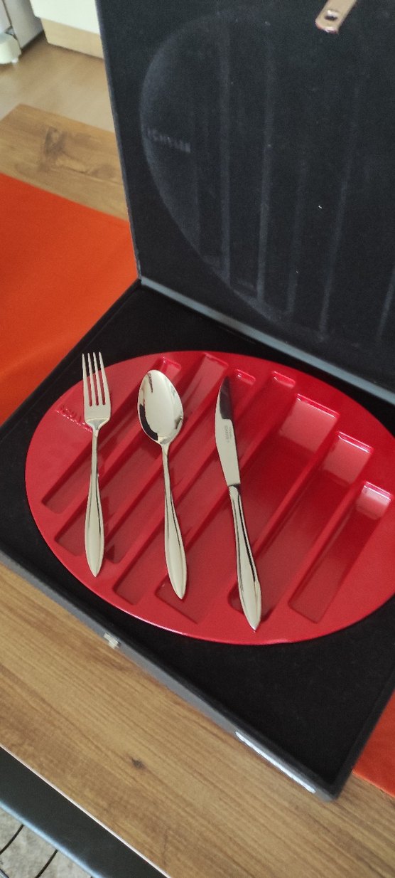Parlak kaplamalı çatal, kaşık ve bıçak içeren çatal seti, koyu kadife kutuda sunulmuştur. Paslanmaz Çelik ürün.Yemek seti de sayfamda mevcut.