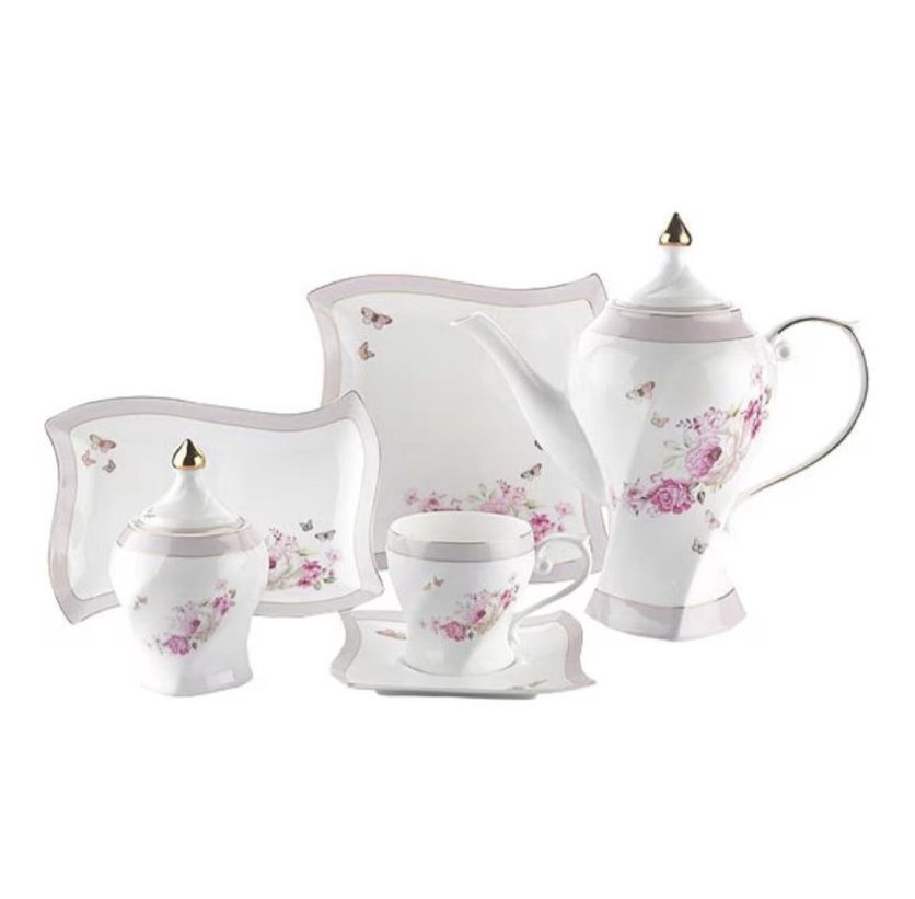Beyaz porselen çay seti, pastel çiçek desenleri ve kelebek detaylarıyla modern klasik tarzda. İçinde çaydanlık, şekerlik, fincan ve tabaklar bulunur. ☕