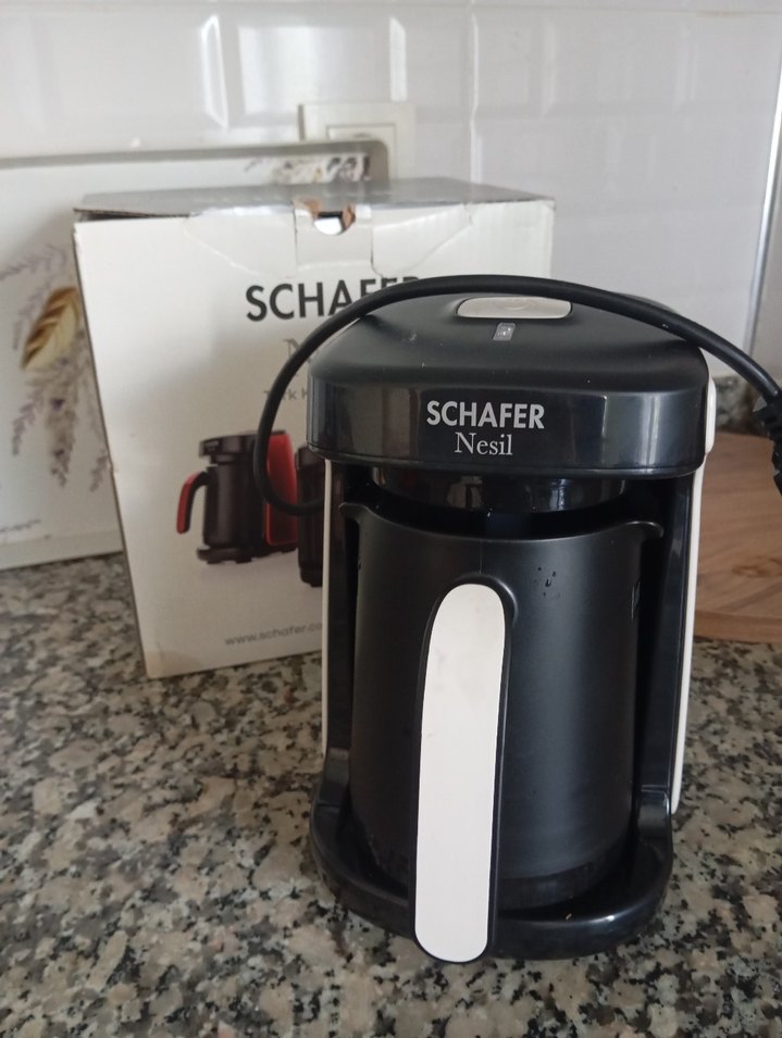 Schafer Nesil kahve makinesi, koyu renk üst kısmı ve beyaz tutma kolu ile işlevsel ve kompakt tasarıma sahiptir. ☕