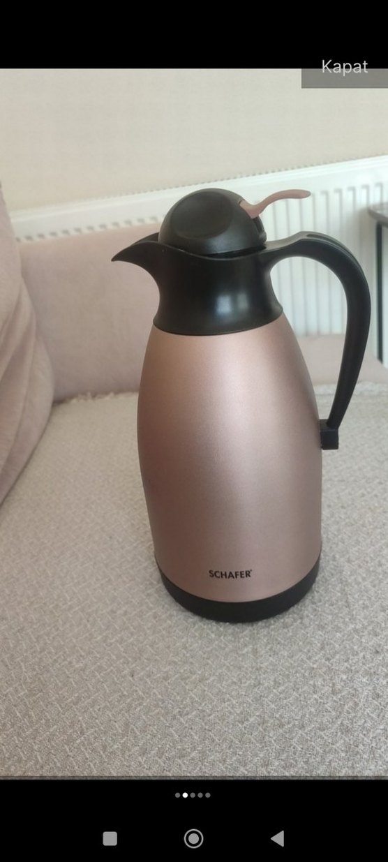 Schafer marka parlak bej renkte, siyah saplı ve kapaklı termos İçeceklerin sıcak kalmasını sağlar. ☕ herhangi hiçbir sorunu yok, çok az kullanıldı. özel üretim