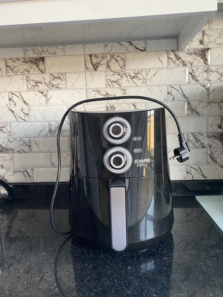 Schafer siyah hava fritözü, ayarlanabilir sıcaklık ve zamanlayıcı kontrollerine sahiptir. Kompakt tasarımı mutfak tezgahına uygundur. ⚡