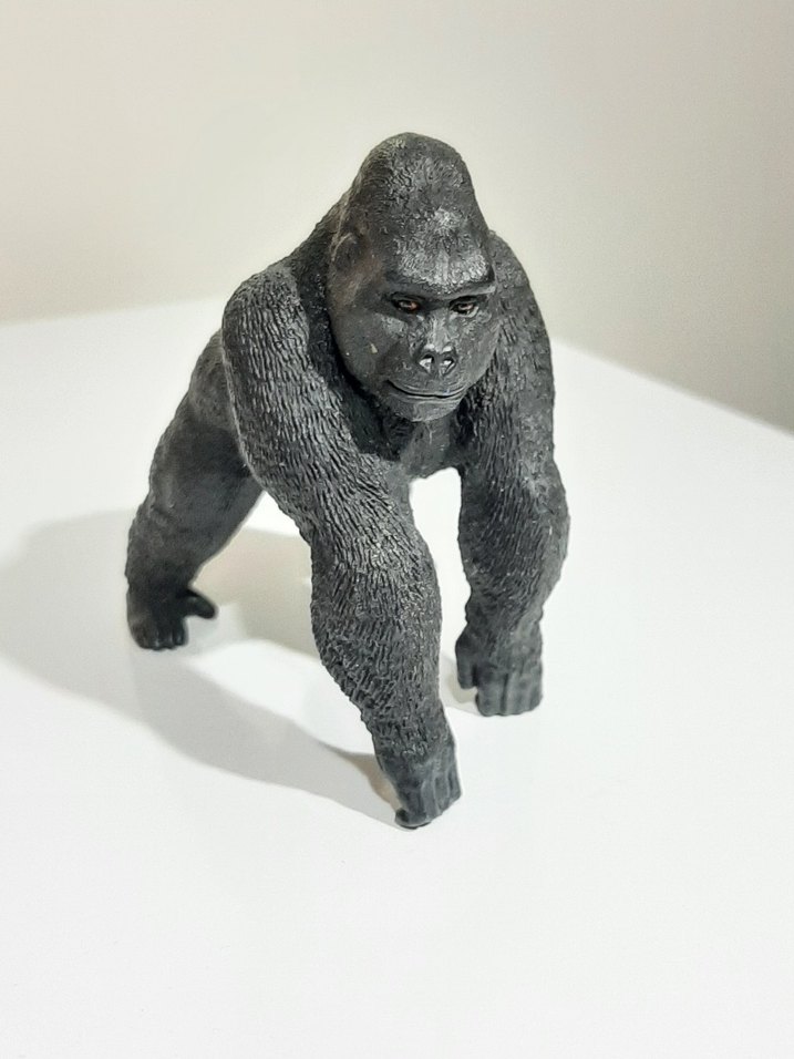 Detaylı dokulu gri goril aksiyon figürü, güçlü duruşuyla dikkat çekiyor. Figür dört ayak üzerinde duruyor.