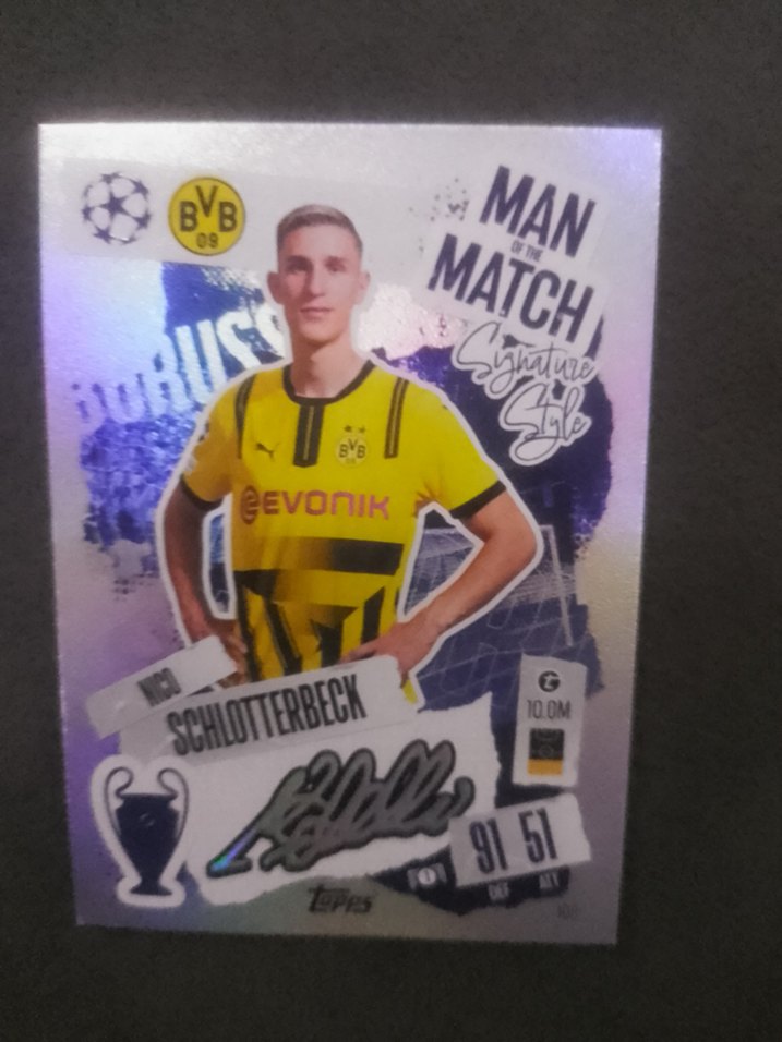 Sarı Borussia Dortmund formasıyla Schlotterbeck'in yer aldığı, pop kültür ve athleisure tarzında erkek rozeti. 'MAN MATCH Signature Style' yazısı ve kulüp logoları içerir. ⚽