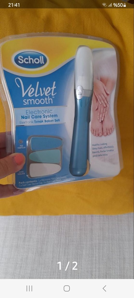Scholl Velvet Smooth elektronik tırnak bakım seti, pastel mavi renkte, tırnaklarınızı nazikçe ve etkili şekilde bakım yapmanızı sağlar.
