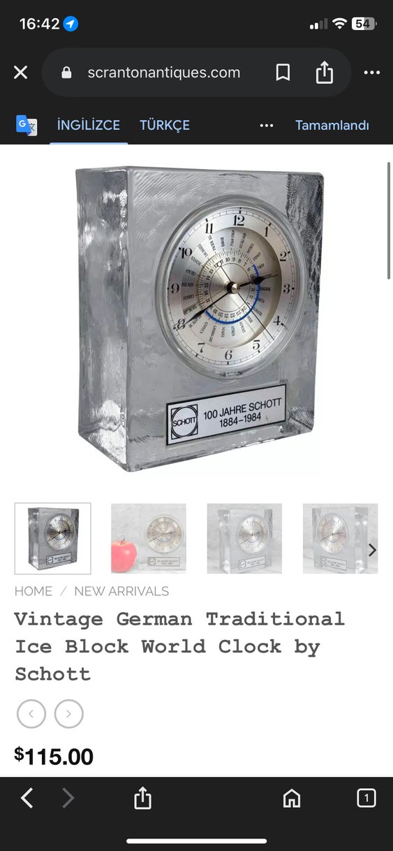 Schott'un 1884-1984 yılları arasını kutlayan vintage Alman buz blok tasarımlı dünya saati, çoklu zaman dilimlerini gösteren beyaz kadrana sahiptir çok güzel şık bir saattir