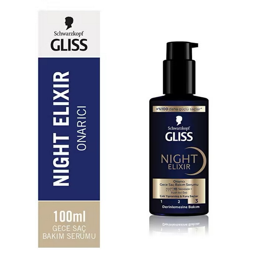 Schwarzkopf Gliss Night Elixir 100ml onarıcı gece saç bakım serumu, saçları uyurken derinlemesine güçlendirir ve onarır. Saç dayanıklılığını artırır.