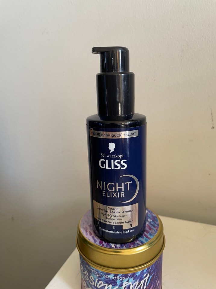 Schwarzkopf Gliss Night Elixir, gece boyunca saç onarımı ve bakım sağlar. Saçı güçlendirir ve derinlemesine besler. %60 full, Son fotoda kalem ucu ile gösterdiğim kısma kadar kullanıldı. #GlissNightElixirGeceBakımSerumu
