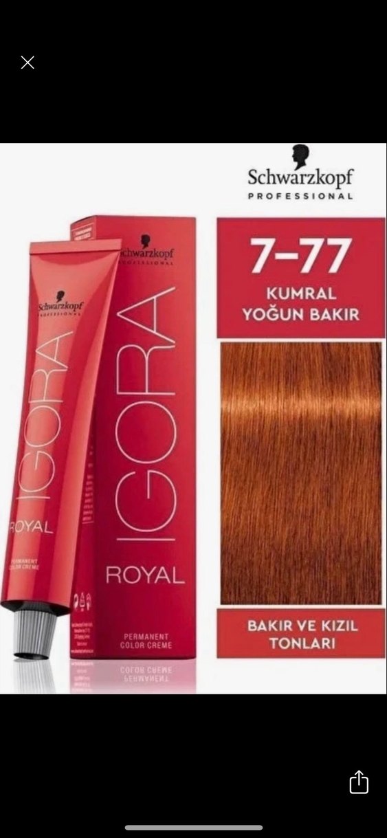 Schwarzkopf Igora Royal 7-77 kalıcı saç boyası, yoğun bakır ve kızıl tonları sunar. Saçlara zengin ve sıcak bir renk verir.