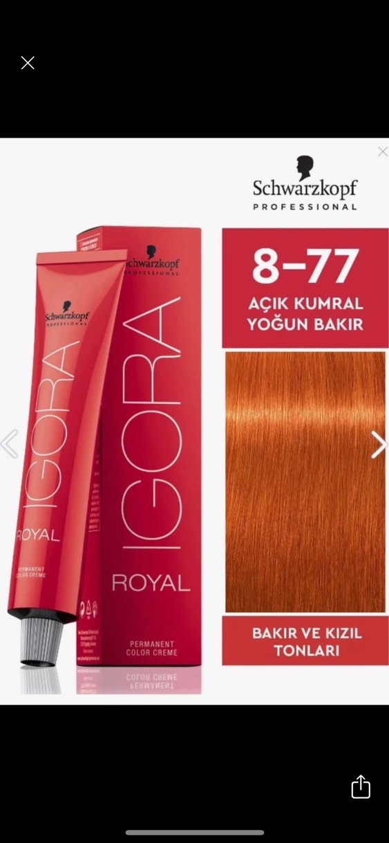 Schwarzkopf Igora Royal 8-77, açık kumral bazda yoğun bakır ve kızıl tonları sunan kalıcı saç boyasıdır. Krem formülüyle canlı ve kalıcı renk sağlar.
