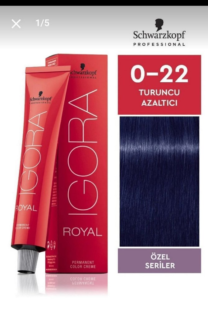 Schwarzkopf Igora Royal 0-22 turuncu azaltıcı, turuncu tonları azaltan kalıcı saç boyası kremidir. Özel serilerde derin, soğuk renk sağlar.