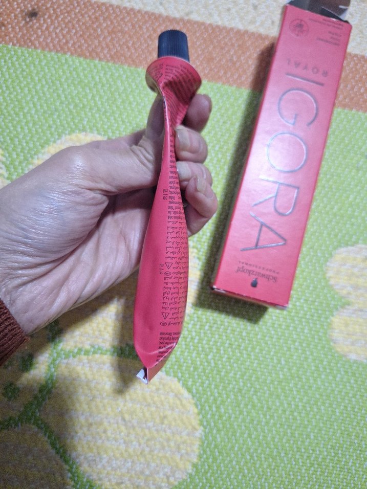 Schwarzkopf Igora saç boyası, zengin pigmentasyonlu kırmızı tüpte, profesyonel saç boyama için uygun. Kutusunda.