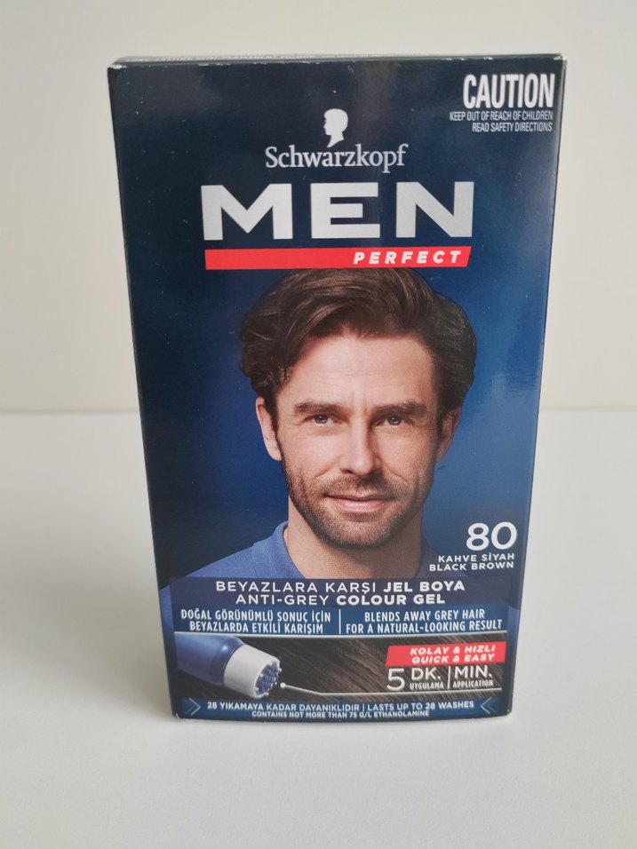 Schwarzkopf Men Perfect 80 numara siyah jel saç boyası, beyazlara karşı etkili kapatma sağlar. Doğal renk ve uzun süre kalıcı sonuç sunar.