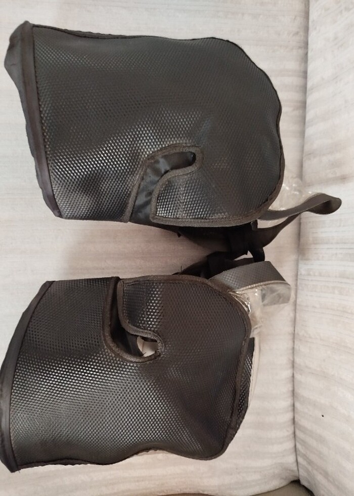 cırtları sağlam, su geçirmez. lastikli olduğu için takması kolay. içi kalın sıcak tutuyor. kullanıldığı için tozlu. ön taraftaki köşe şeffaf kısımda küçük delikler var.