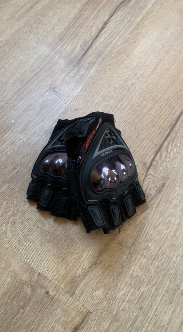 Desenli ve koruyucu knuckle bölgesi olan siyah biker eldiven. Gotik ve rock punk tarzına uygun, parmakları açık tasarım.