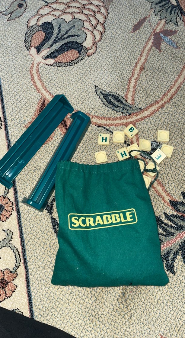 Scrabble kelime oyunu seti; koyu yeşil harf rafları ve Scrabble logosu olan çekmeli torba içerir. Harf taşları ile oynanır.