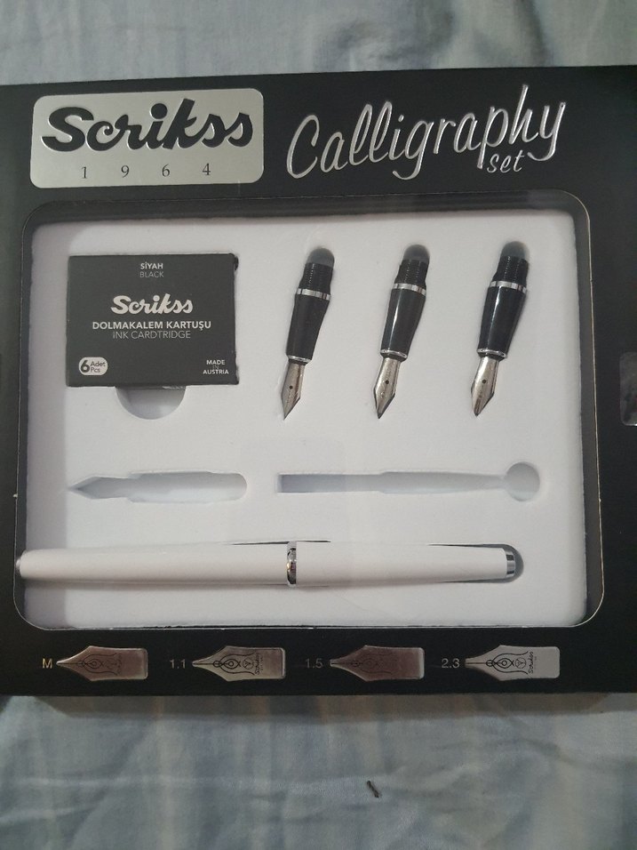 Scrikss kaligrafi seti; beyaz gövde, üç farklı uç ve mürekkep kartuşu içerir. Farklı uç boyutlarıyla detaylı yazım sağlar. ️