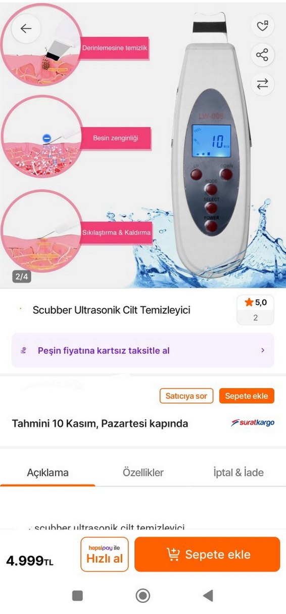 Sıfır kullanılmamıştır. Ultrasonik cilt temizleyici, cilt besin zenginliğini artırır ve sıkılaştırma sağlar. Dijital ekran ve kontrol düğmeleri bulunur.