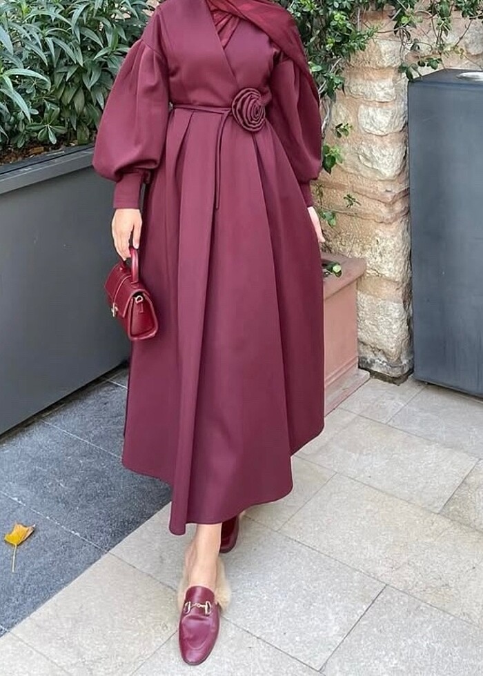Scuba kumaş gül detaylı bordo elbise.Sadece 1 kez 2 saat giyildi.Çok şık duruyor.Markası quqa dır