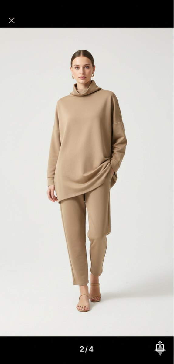 38 44 beden kadar uygun Yumuşak ve sıcak kumaştan, yüksek yakalı ve uzun kollu, bej renkli bol kesim rahat takımdır. Uzun boyu ve sade tasarımıyla günlük kullanıma uygundur.