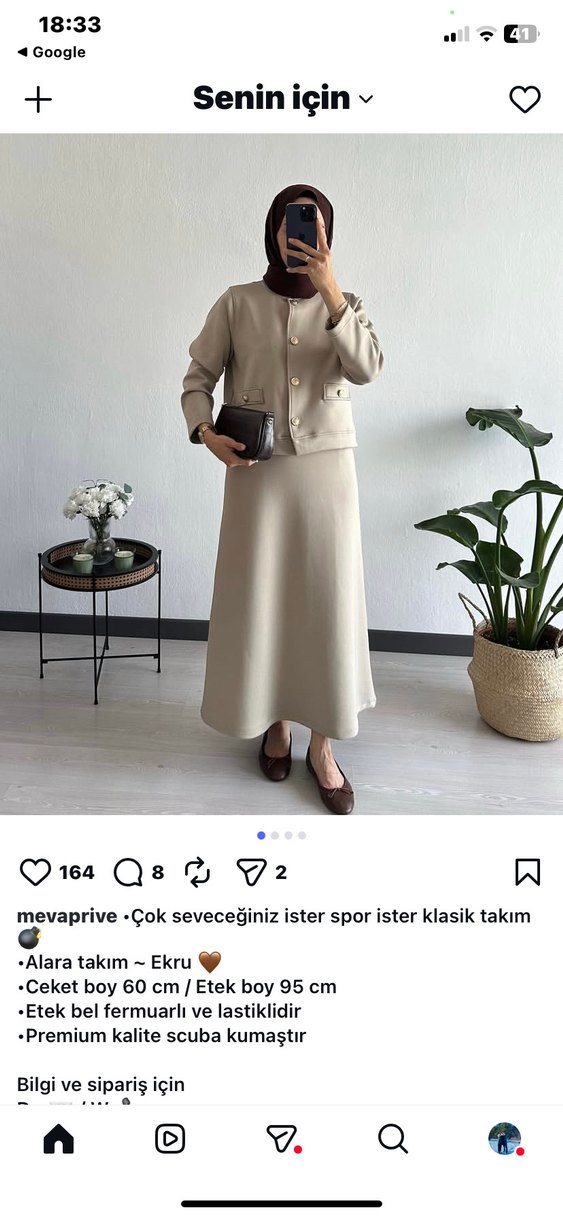 Bej renkte, uzun deri ceket ve uyumlu uzun etekten oluşan kadın takımı. Notlu yaka ve uzun kollu, klasik şıklık sunan regular fit, ofis için ideal. Ceket boyu 60 cm, etek boyu 95 cm.