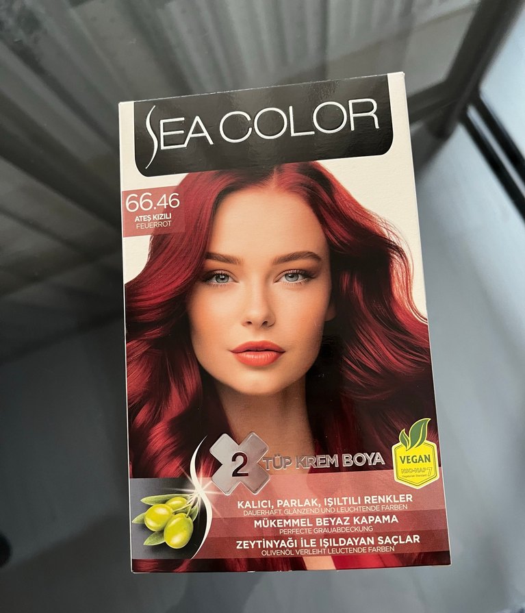 Sea Color 66.46 Ateş Kızılı krem saç boyası, zeytinyağı ile parlak ve ışıldayan saçlar sağlar. Mükemmel beyaz kapama ve kalıcı renk sunar. Vegan formüldür.