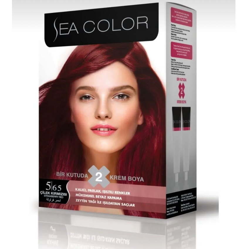 Sea Color krem saç boyası çilek kırmızısı renginde, kalıcı, parlak ve mükemmel beyaz kapama sağlar, zeytin yağı ile saçlara ışıltı katar.
