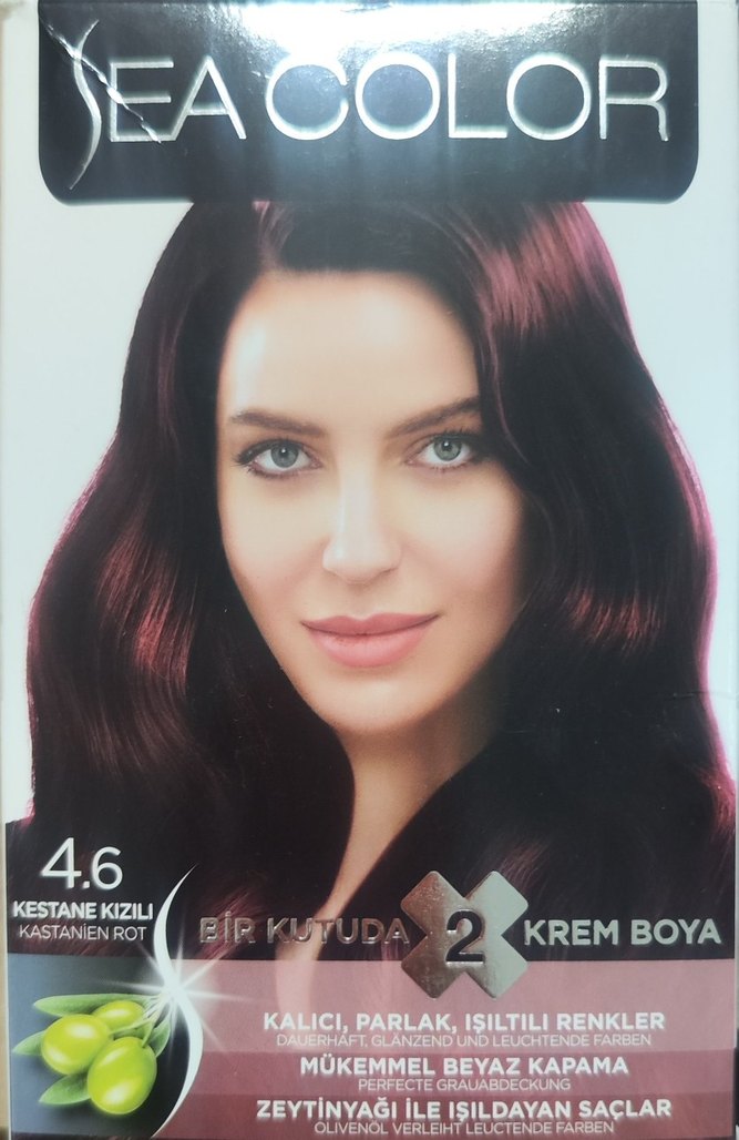 Sea Color kestane kızıl saç boyası, kalıcı ve parlak renkler sunar. Mükemmel beyaz kapama sağlar. İki krem boya mevcuttur. (stoklamak için almıştım kızıldan döndüğüm için satıyorum)