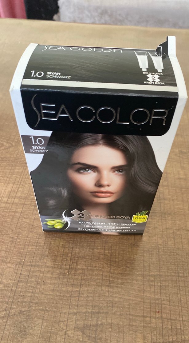 Sea Color siyah saç boyası 1.0, doğal yağlar içeren krem formülüyle uzun süre kalıcı renk sağlar.