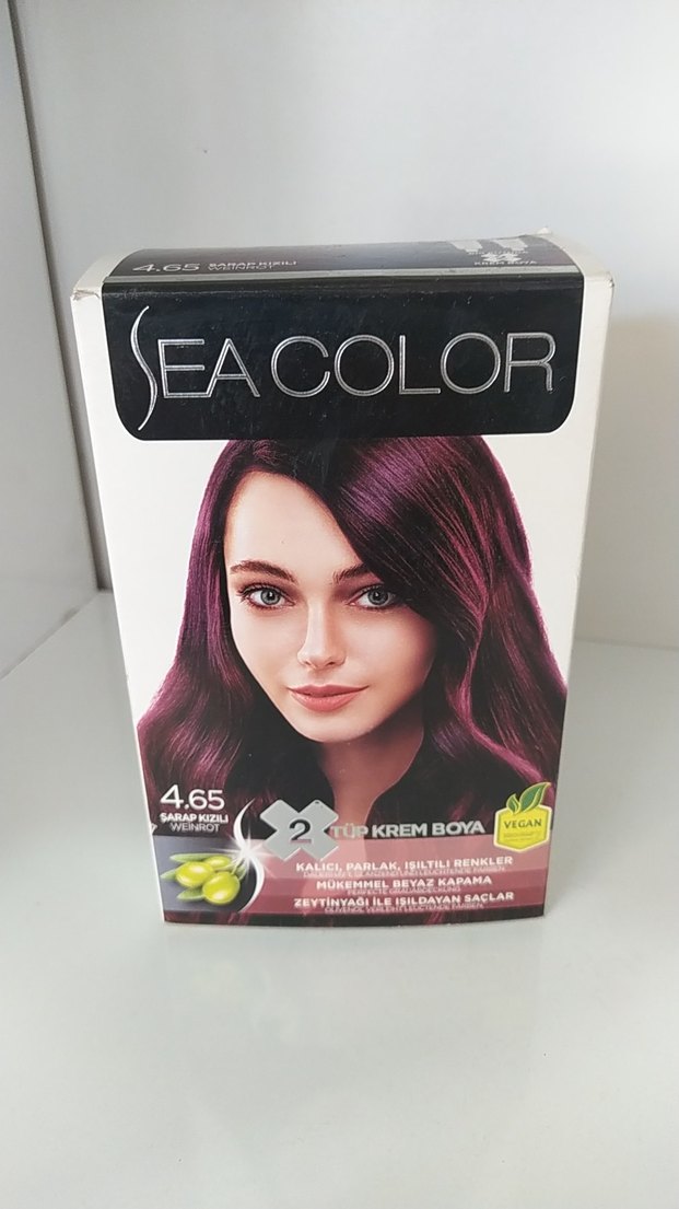 SEA COLOR kutu içerisinde iki tüp boya, bir oksidan, eldiven ve saç bakım kremi vardır