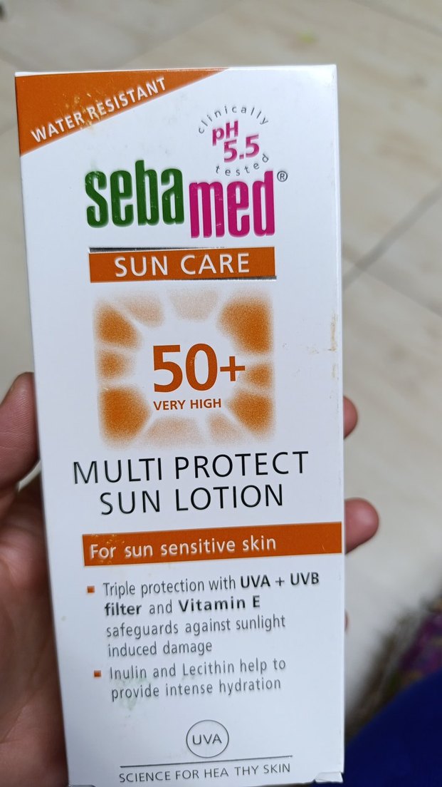Sebamed 50+ Çoklu Koruma Güneş Losyonu, UVA ve UVB filtreleri ile çok yüksek koruma sağlar. İnülin ve Lesitin ile yoğun nemlendirme sunar, suya dayanıklıdır ve güneşe hassas ciltler için uygundur. (orijinal)