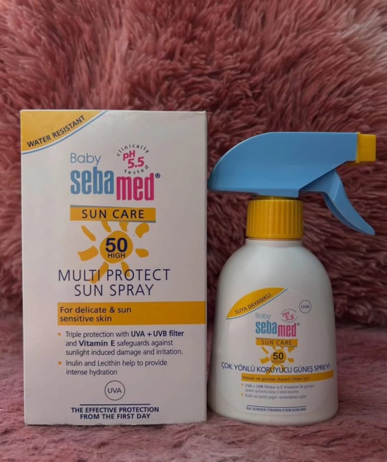 Sebamed Bebek Güneş Koruyucu Sprey SPF 50, UVA ve UVB filtreleri ile koruma sağlar. Vitamin E, Inulin ve Lesitin ile yoğun nemlendirme ve cilt koruması sunar. Hassas ciltler için uygundur. ☀️