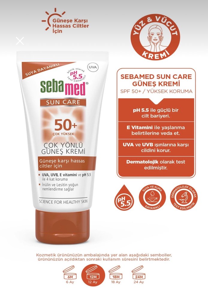 Sebamed SPF 50+ güneş kremi, pH 5.5 ile güçlü cilt bariyeri sağlar. E vitamini içerir, yaşlanma belirtilerine karşı korur. Hassas ciltler için UVA ve UVB koruması sunar. Dermatolojik olarak test edilmiştir.