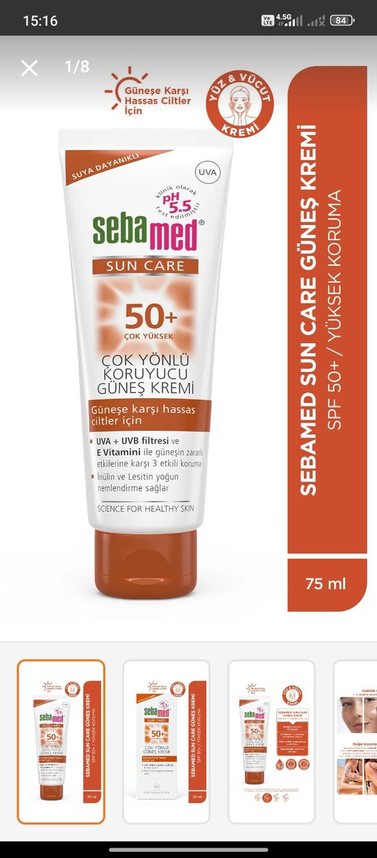 Sebamed Sun Care SPF 50+ güneş kremi, UVA ve UVB ışınlarına karşı çok yönlü koruma sağlar. E vitamini ve lesitin ile hassas cildi besler ve korur. ☀️