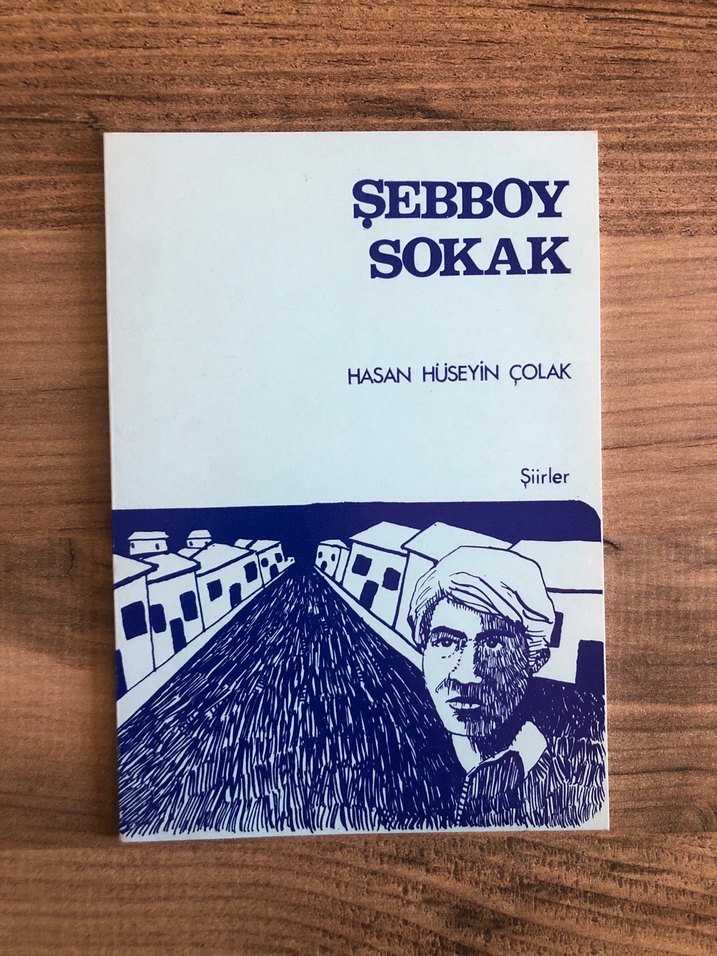 Hasan Hüseyin Çolak'ın 'Şebboy Sokak' adlı şiir kitabı, mavi beyaz kapak ve illüstrasyon içerir.