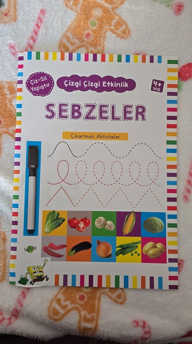 4 yaş ve üzeri çocuklar için sebzeler temalı çizgi çizgi etkinlik kitabı, çıkarılabilir çıkartmalar. kalemi mevcut degildir. ✏️