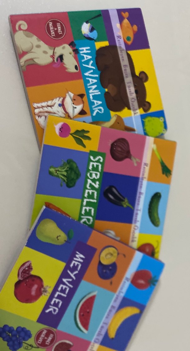 Sebzeler, hayvanlar ve meyveler konulu, renkli resimli çocuk kitapları seti. Bir tek sebzeler kitabının tek sayfası kalemle çizilmiş. Geri kalanların hepsi yeni gibi tertemiz