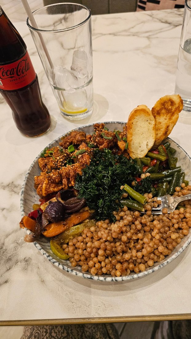 Sebzeler, tahıllar ve çıtır ekmek parçaları içeren besleyici köpek maması tabağı, içecekle servis edilir. ️