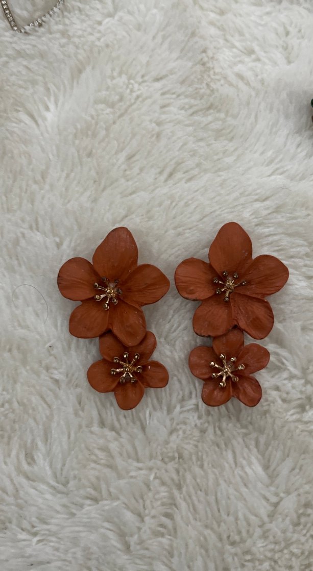 Kahverengi çiçek desenli, boncuk detaylı, kısa uzunlukta ve bohem tarzda düğünlere uygun küpeler.