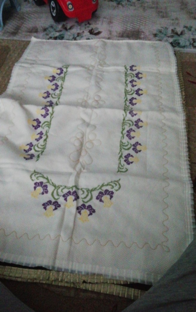 Beyaz renkte, mor ve sarı nakış işlemeli çiçek desenlerine sahip, klasik tarzda etamin işlemeli