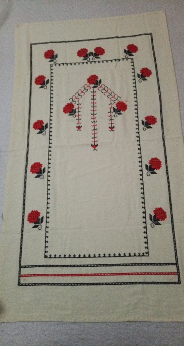 Krem renginde, etamin üstüne kırmızı çiçek işlemeleriyle süslenmiş geleneksel kenarları desenli bordürlü seccade çeyizliktir hiçbir işlem yapılmamıştır işlenip bırakılmıştır