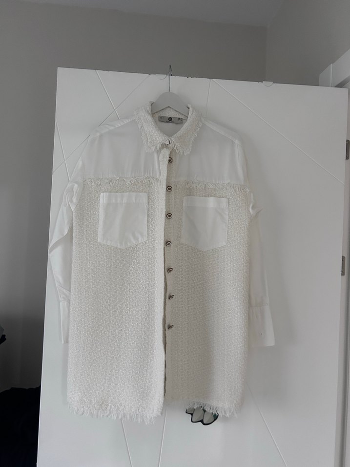 Boy 77 cm sırttan 2 kol arası 58 cm sorunsuz lekesiz Uzun kollu, düğmeli beyaz pamuk gömlek. Notch yakalı, bol kesim ve önünde iki cep bulunur. Alt kısmında dokulu tasarımı vardır.