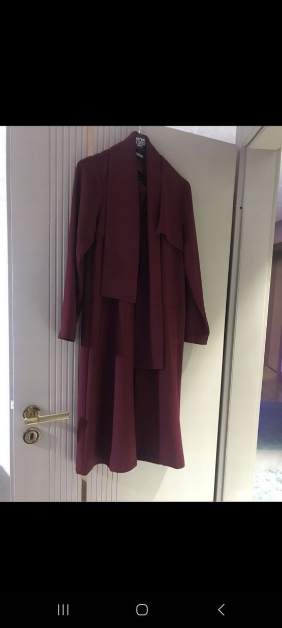 Bordo renkli, dökümlü uzun kadın kabanı, yakasında notalı rever ve uzun kollu. Ofis ve iş ortamına uygun, regular fit ve ipeksi dokuda, desensiz şık tasarım.