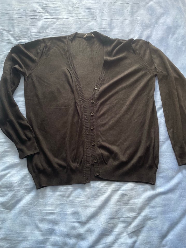 Seçim Kahverengi, keten kumaştan, düğmeli, V yaka, uzun kollu, normal midi boyda, bol kesim kadın hırkası. Günlük rahat kullanıma uygundur. Beden:M Boy:65cm Genişlik:55cm Kol:60cm